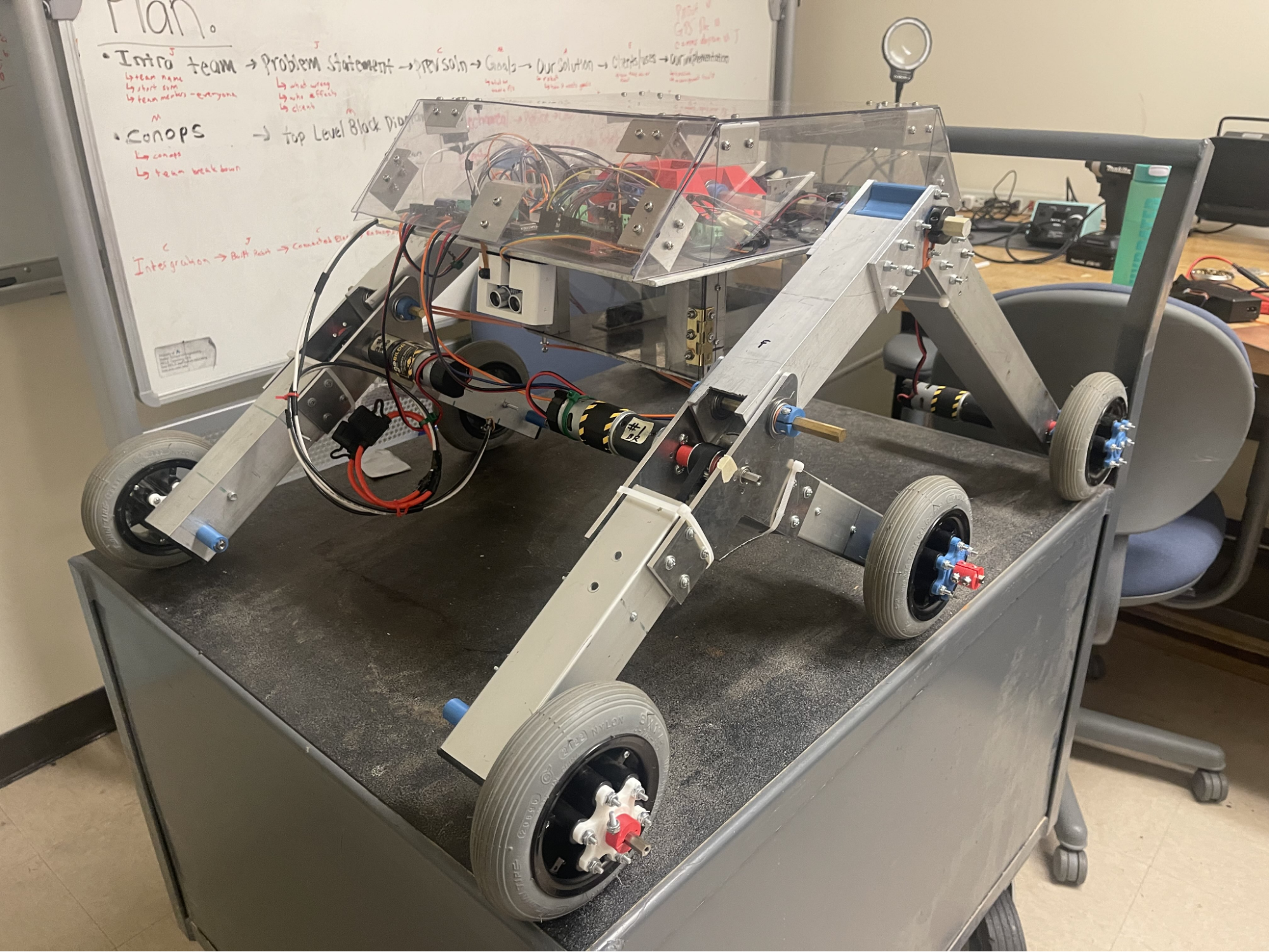 I worked on the mechanical design, electrical systems, and control software, with